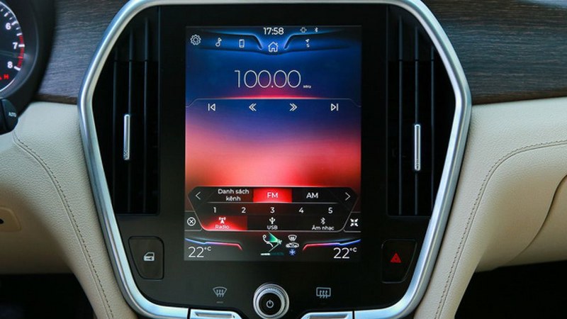 Trang chủ màn hình sẽ chỉ có 03 biểu tượng truy cập (gồm điện thoại – định vị – âm thanh) và dòng trạng thái hiển thị hệ thống kiểm soát khí hậu trên xe. Bao lấy màn hình là hai cửa gió điều hòa dạng ngũ giác chạy dọc tạo cảm giác gọn gàng và liền mạch. Hệ thống âm thanh trên xe là loại 8 loa ở bản tiêu chuẩn và 13 loa ở bản cao cấp.